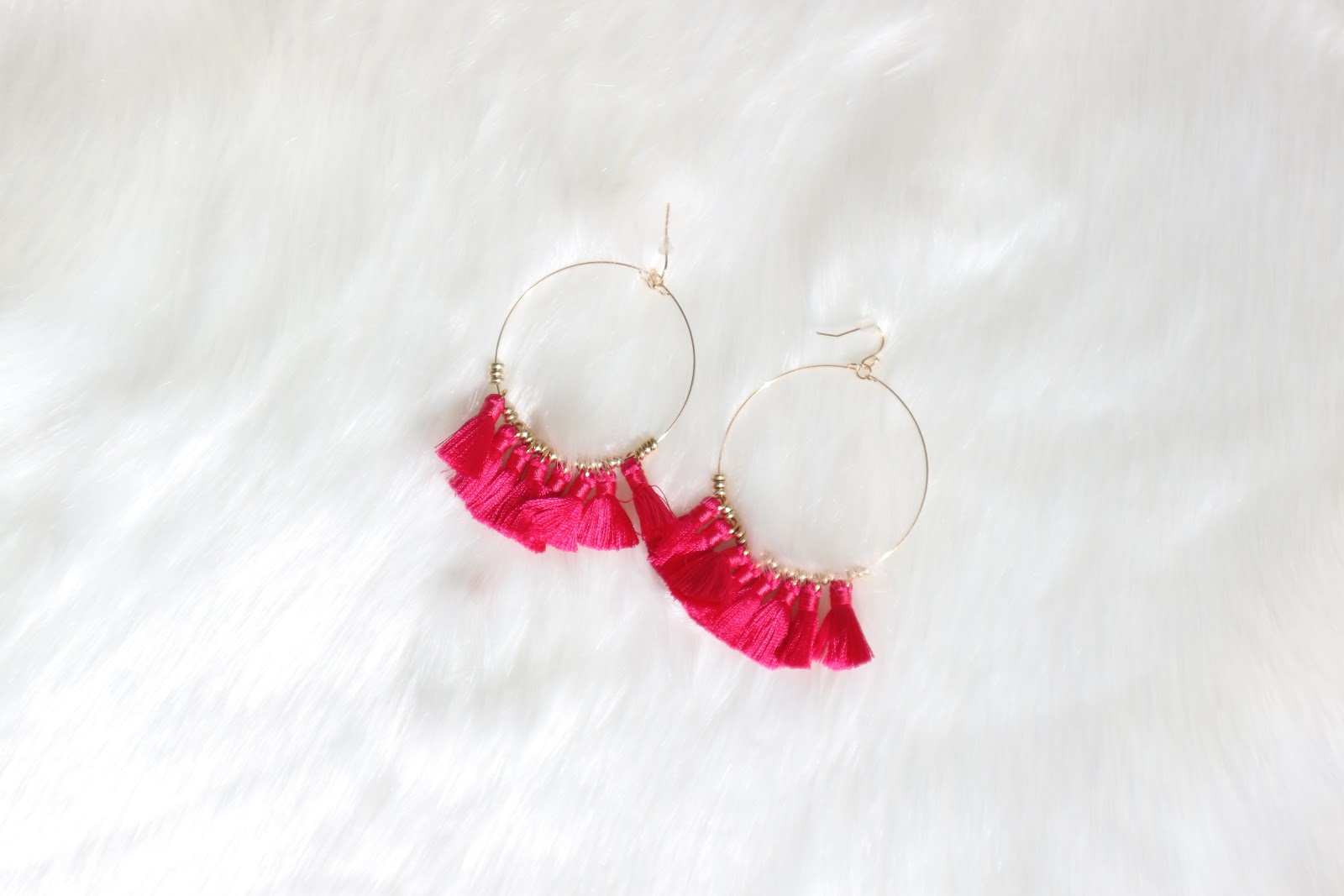 Rendi-me à moda deste género de brincos com "fios" e escolhi estes rosa. No site pareciam um pouco mais pequenos, mas como tenho o cabelo comprido e volumoso, não fica assim tão mal 😋